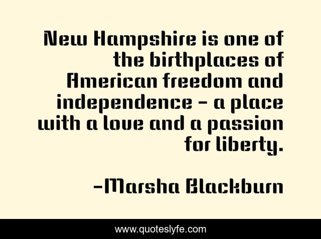 This page presents the quote "New Hampshire is one of the birthplaces of American freedom and independence - a place with a love and a passion for liberty.". Author of this quote is Marsha Blackburn. This quote is about freedom, passion, affection, love,.