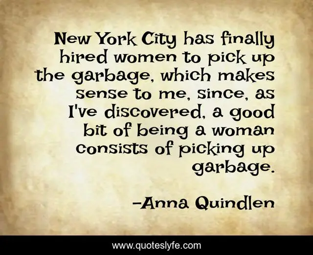 This page presents the quote "New York City has finally hired women to pick up the garbage, which makes sense to me, since, as I've discovered, a good bit of being a woman consists of picking up garbage.". Author of this quote is Anna Quindlen. This quote is about new-york-city, gender-stereotypes,.