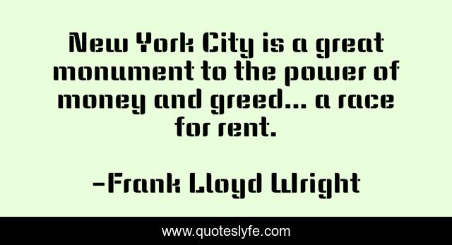 This page presents the quote "New York City is a great monument to the power of money and greed... a race for rent.". Author of this quote is Frank Lloyd Wright. This quote is about money, great, greed,.