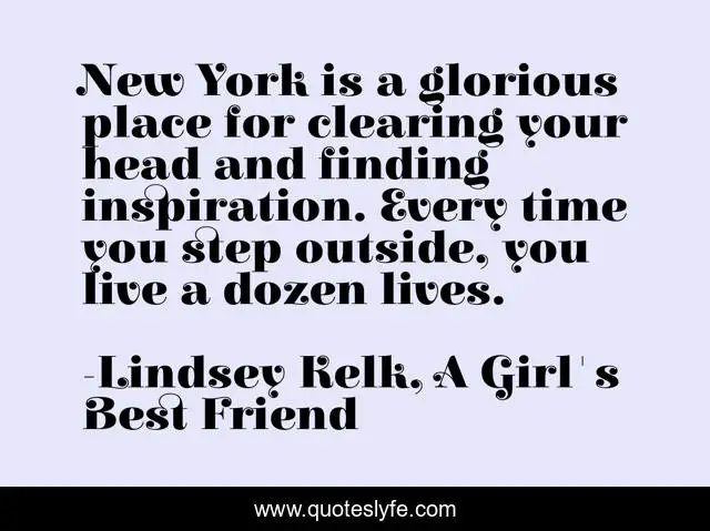 This page presents the quote "New York is a glorious place for clearing your head and finding inspiration. Every time you step outside, you live a dozen lives.". Author of this quote is Lindsey Kelk, A Girl's Best Friend. This quote is about life, fashion, love, career, photographer, new-york, passion, adventure, friendship,.