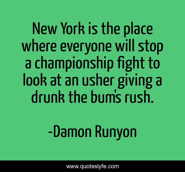 This page presents the quote "New York is the place where everyone will stop a championship fight to look at an usher giving a drunk the bum's rush.". Author of this quote is Damon Runyon. .