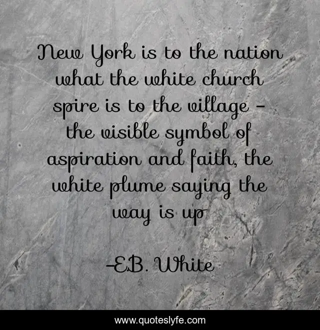 This page presents the quote "New York is to the nation what the white church spire is to the village - the visible symbol of aspiration and faith, the white plume saying the way is up". Author of this quote is E.B. White. .