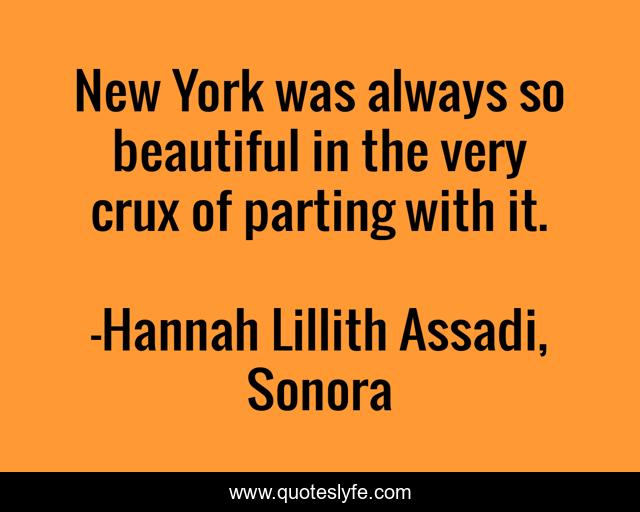 This page presents the quote "New York was always so beautiful in the very crux of parting with it.". Author of this quote is Hannah Lillith Assadi, Sonora. This quote is about beautiful, new-york-city, hannah-lillith-assadi, parting, sonora,.