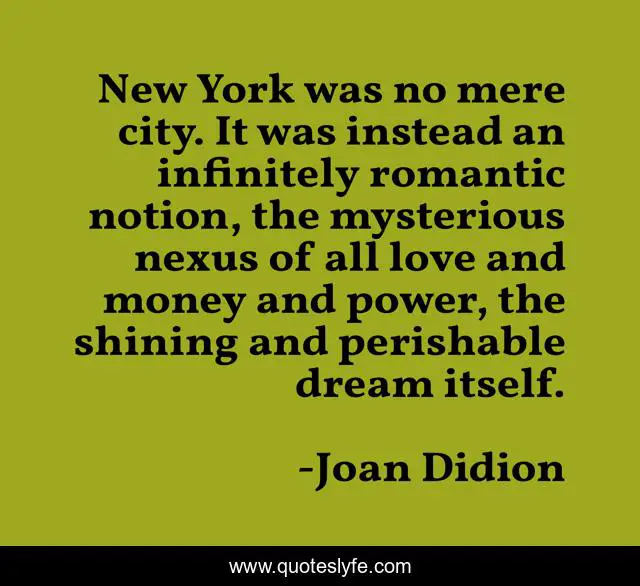 This page presents the quote "New York was no mere city. It was instead an infinitely romantic notion, the mysterious nexus of all love and money and power, the shining and perishable dream itself.". Author of this quote is Joan Didion. This quote is about money, love, power, affection,.