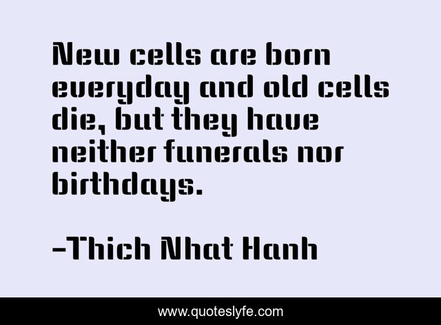 This page presents the quote "New cells are born everyday and old cells die, but they have neither funerals nor birthdays.". Author of this quote is Thich Nhat Hanh. This quote is about ecology, peace, the-world-we-have,.