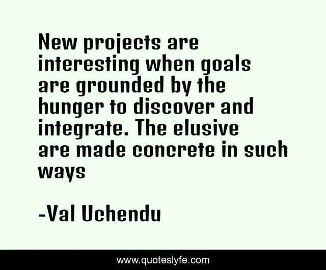 This page presents the quote "New projects are interesting when goals are grounded by the hunger to discover and integrate. The elusive are made concrete in such ways". Author of this quote is Val Uchendu. This quote is about hunger, project, concrete, adventure, goals, discovery,.