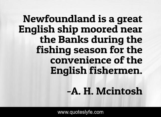 This page presents the quote "Newfoundland is a great English ship moored near the Banks during the fishing season for the convenience of the English fishermen.". Author of this quote is A. H. Mcintosh. This quote is about canada, canadians,.