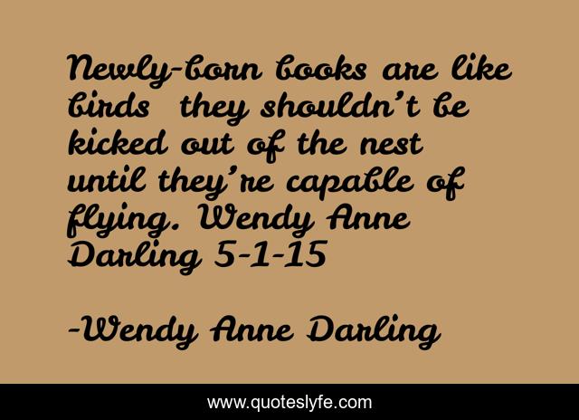 This page presents the quote "Newly-born books are like birds… they shouldn’t be kicked out of the nest until they’re capable of flying. Wendy Anne Darling 5-1-15". Author of this quote is Wendy Anne Darling. This quote is about quote, books, birds, wendy-anne-darling,.