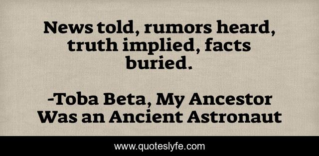 This page presents the quote "News told, rumors heard, truth implied, facts buried.". Author of this quote is Toba Beta, My Ancestor Was an Ancient Astronaut. This quote is about news, rumors, fact, truth,.