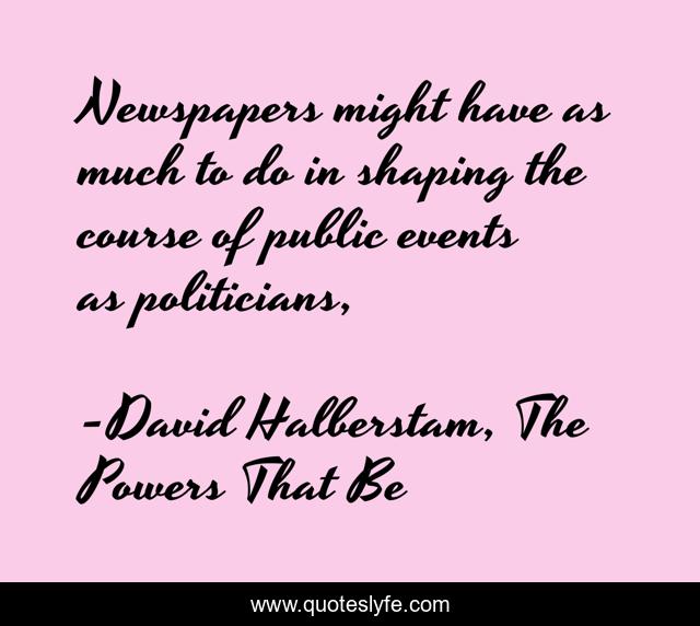 This page presents the quote "Newspapers might have as much to do in shaping the course of public events as politicians, ". Author of this quote is David Halberstam, The Powers That Be. This quote is about culture, media,.