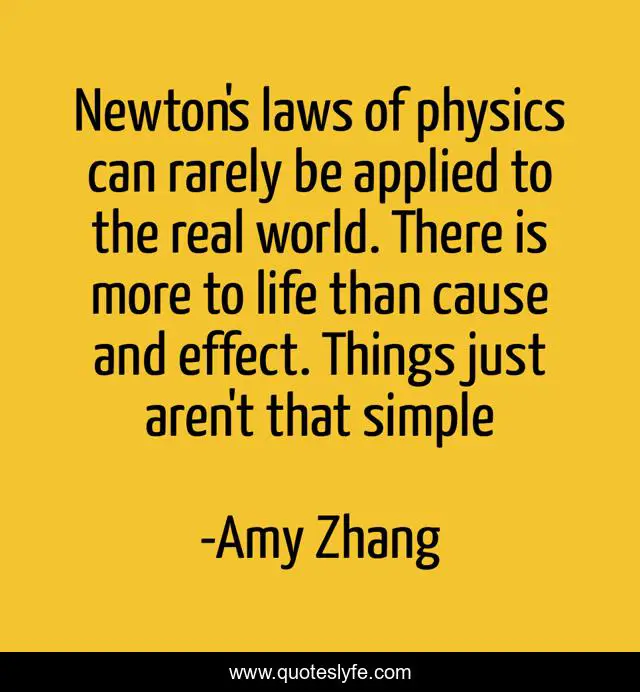 This page presents the quote "Newton's laws of physics can rarely be applied to the real world. There is more to life than cause and effect. Things just aren't that simple". Author of this quote is Amy Zhang. This quote is about broken-heart, suicide, love, simple, real-world, reality, broken, bliss, inspirational,.