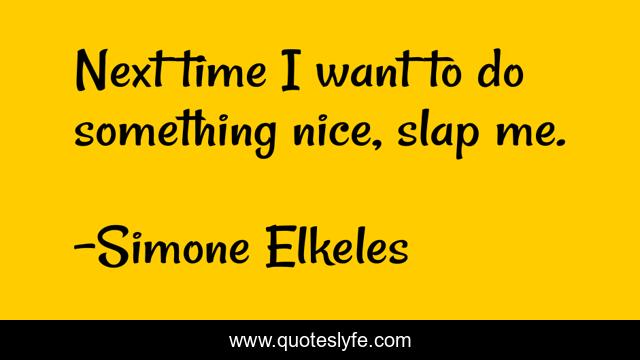 This page presents the quote "Next time I want to do something nice, slap me.". Author of this quote is Simone Elkeles. This quote is about carlos-fuentes, humour, rules-of-attraction,.