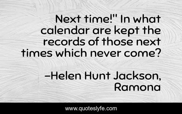 This page presents the quote "Next time!" In what calendar are kept the records of those next times which never come?". Author of this quote is Helen Hunt Jackson, Ramona. This quote is about female-author, ramona, old-california, native-american, future, california, helen-hunt-jackson, love-story, time,.