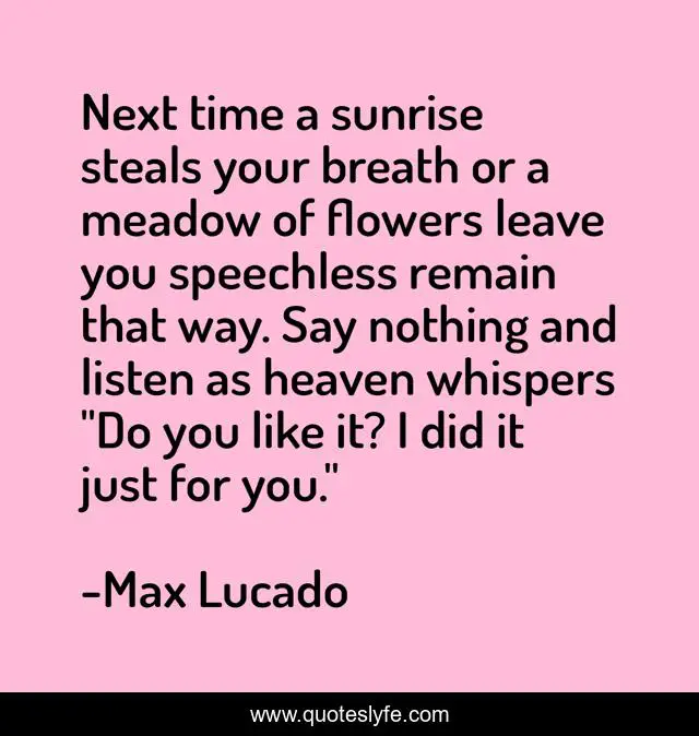 This page presents the quote "Next time a sunrise steals your breath or a meadow of flowers leave you speechless remain that way. Say nothing and listen as heaven whispers "Do you like it? I did it just for you."". Author of this quote is Max Lucado. .