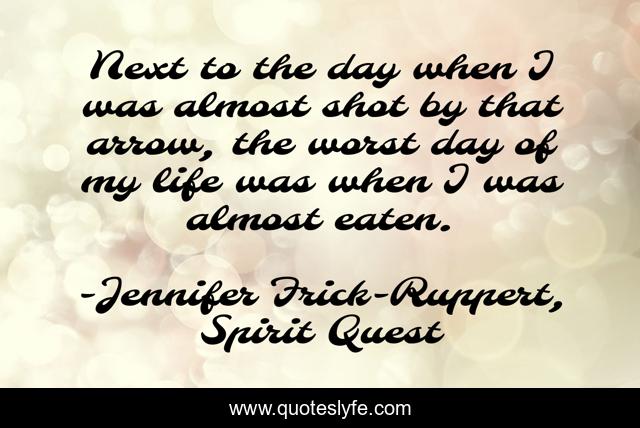 This page presents the quote "Next to the day when I was almost shot by that arrow, the worst day of my life was when I was almost eaten.". Author of this quote is Jennifer Frick-Ruppert, Spirit Quest. This quote is about worst-day, life-lessons, native-american, mishaps, bad-day, life-or-death, native-american-wisdom, life-or-death-moments, adventure,.