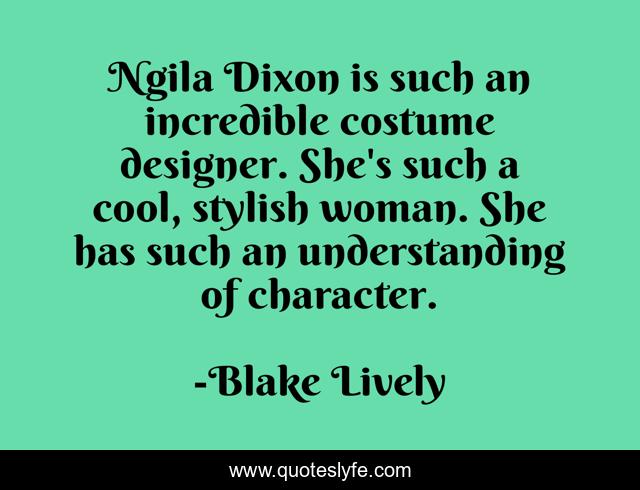 This page presents the quote "Ngila Dixon is such an incredible costume designer. She's such a cool, stylish woman. She has such an understanding of character.". Author of this quote is Blake Lively. This quote is about woman, character,.