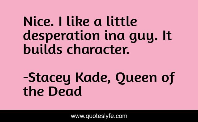 This page presents the quote "Nice. I like a little desperation ina guy. It builds character.". Author of this quote is Stacey Kade, Queen of the Dead. This quote is about ghost, goth, queen, kade, dead, alona, stacey,.