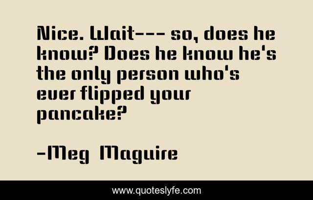 This page presents the quote "Nice. Wait--- so, does he know? Does he know he's the only person who's ever flipped your pancake?". Author of this quote is Meg Maguire. .