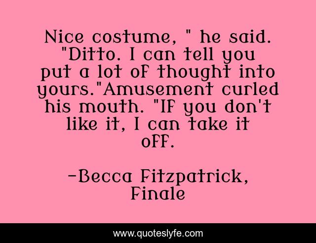 This page presents the quote "Nice costume, " he said. "Ditto. I can tell you put a lot of thought into yours."Amusement curled his mouth. "If you don't like it, I can take it off.". Author of this quote is Becca Fitzpatrick, Finale. This quote is about funny, love, becca-fitzpatrick, sweet, finale, patch-and-nora, hush-hush, nora-grey, comedy,.