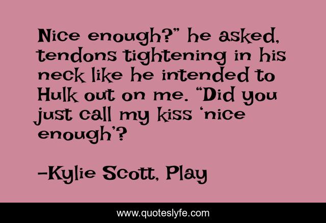 This page presents the quote "Nice enough?” he asked, tendons tightening in his neck like he intended to Hulk out on me. “Did you just call my kiss ‘nice enough’?". Author of this quote is Kylie Scott, Play. This quote is about play, stage-dive, malcolm, anne, mal,.