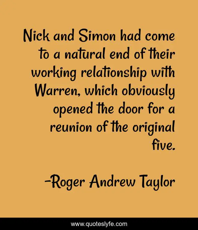 This page presents the quote "Nick and Simon had come to a natural end of their working relationship with Warren, which obviously opened the door for a reunion of the original five.". Author of this quote is Roger Andrew Taylor. This quote is about door, end, reunion,.