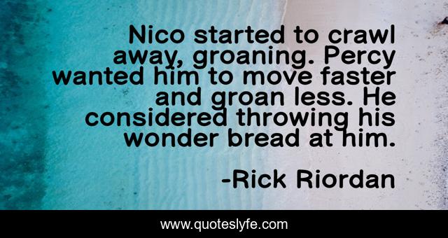 This page presents the quote "Nico started to crawl away, groaning. Percy wanted him to move faster and groan less. He considered throwing his wonder bread at him.". Author of this quote is Rick Riordan. This quote is about wonder-bread, nico-di-angelo, percy-jackson,.