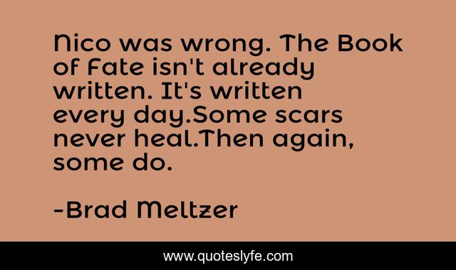This page presents the quote "Nico was wrong. The Book of Fate isn't already written. It's written every day.Some scars never heal.Then again, some do.". Author of this quote is Brad Meltzer. .