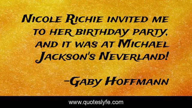 This page presents the quote "Nicole Richie invited me to her birthday party, and it was at Michael Jackson's Neverland!". Author of this quote is Gaby Hoffmann. This quote is about me, party, her,.
