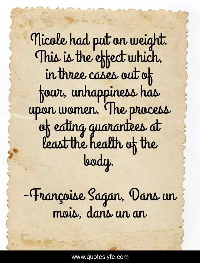This page presents the quote "Nicole had put on weight. This is the effect which, in three cases out of four, unhappiness has upon women. The process of eating guarantees at least the health of the body.". Author of this quote is Françoise Sagan, Dans un mois, dans un an. This quote is about food, sadness, eating, weight,.