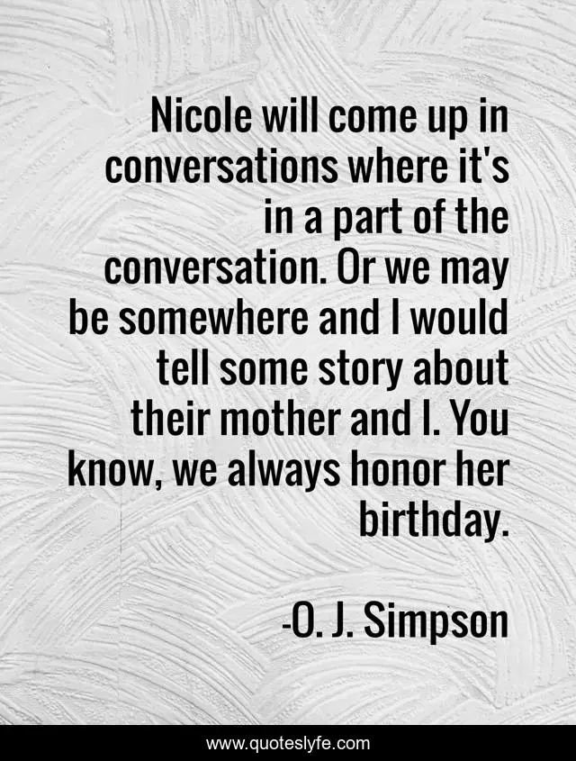 This page presents the quote "Nicole will come up in conversations where it's in a part of the conversation. Or we may be somewhere and I would tell some story about their mother and I. You know, we always honor her birthday.". Author of this quote is O. J. Simpson. This quote is about conversation, honor, mother,.