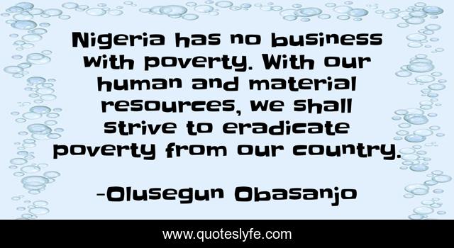 This page presents the quote "Nigeria has no business with poverty. With our human and material resources, we shall strive to eradicate poverty from our country.". Author of this quote is Olusegun Obasanjo. This quote is about country, poverty, human,.