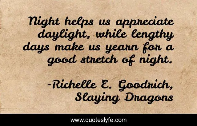 "Richelle E. Goodrich, Slaying Dragons Quotes." Quoteslyfe.com, 2025. Sat. 06 Dec. 2025. <https://www.quoteslyfe.com/quote/Night-helps-us-appreciate-daylight-while-lengthy-180170>.