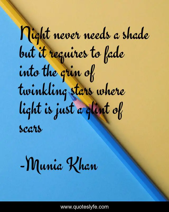 This page presents the quote "Night never needs a shade but it requires to fade into the grin of twinkling stars where light is just a glint of scars". Author of this quote is Munia Khan. This quote is about need, pain, scar, darkness, twinkle, glint, poetry, glint-of-a-star, twinkling-star,.