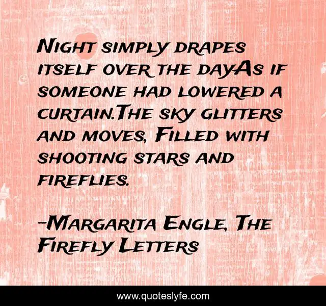This page presents the quote "Night simply drapes itself over the dayAs if someone had lowered a curtain.The sky glitters and moves, Filled with shooting stars and fireflies.". Author of this quote is Margarita Engle, The Firefly Letters. This quote is about imagery, peace, stars, night,.
