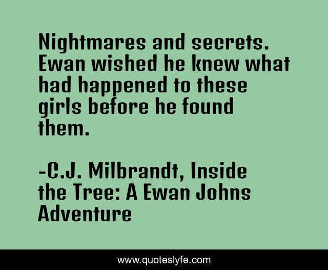 This page presents the quote "Nightmares and secrets. Ewan wished he knew what had happened to these girls before he found them.". Author of this quote is C.J. Milbrandt, Inside the Tree: A Ewan Johns Adventure. This quote is about kid-s-book, family, secrets, wish, kid-s-literature, nightmares, dreams,.