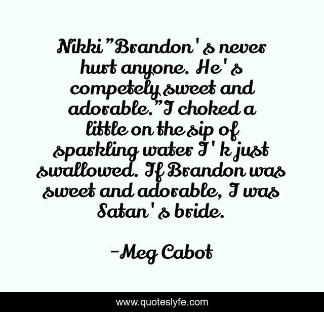 This page presents the quote "Nikki "Brandon's never hurt anyone. He's competely sweet and adorable."I choked a little on the sip of sparkling water I'k just swallowed. If Brandon was sweet and adorable, I was Satan's bride.". Author of this quote is Meg Cabot. This quote is about adorable, satan-s-bride, satan, sweet,.