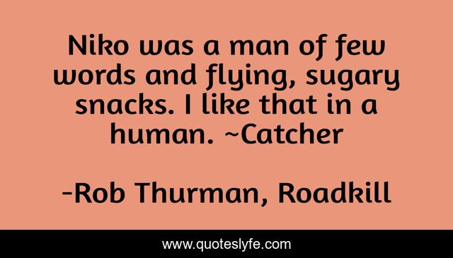 This page presents the quote "Niko was a man of few words and flying, sugary snacks. I like that in a human. ~Catcher". Author of this quote is Rob Thurman, Roadkill. This quote is about sarcasm, twinkies, urban-fantasy, cal-leandros, science-fiction,.