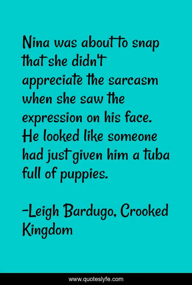 This page presents the quote "Nina was about to snap that she didn't appreciate the sarcasm when she saw the expression on his face. He looked like someone had just given him a tuba full of puppies.". Author of this quote is Leigh Bardugo, Crooked Kingdom. .