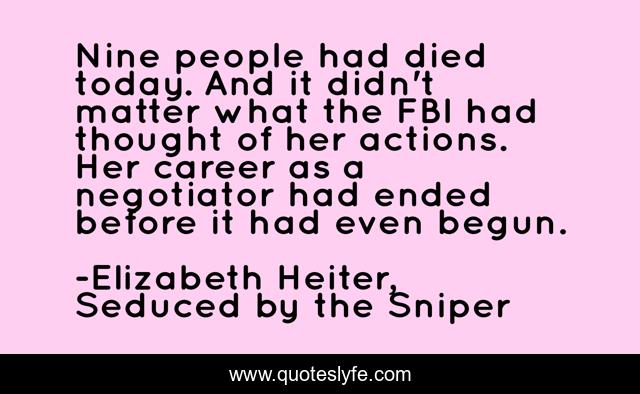This page presents the quote "Nine people had died today. And it didn't matter what the FBI had thought of her actions. Her career as a negotiator had ended before it had even begun.". Author of this quote is Elizabeth Heiter, Seduced by the Sniper. This quote is about harlequin, lawmen, romantic-suspense, fbi, intrigue, sniper,.