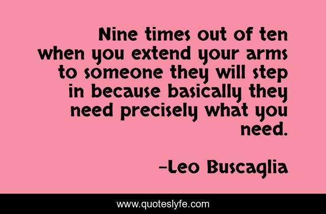 This page presents the quote "Nine times out of ten when you extend your arms to someone they will step in because basically they need precisely what you need.". Author of this quote is Leo Buscaglia. .