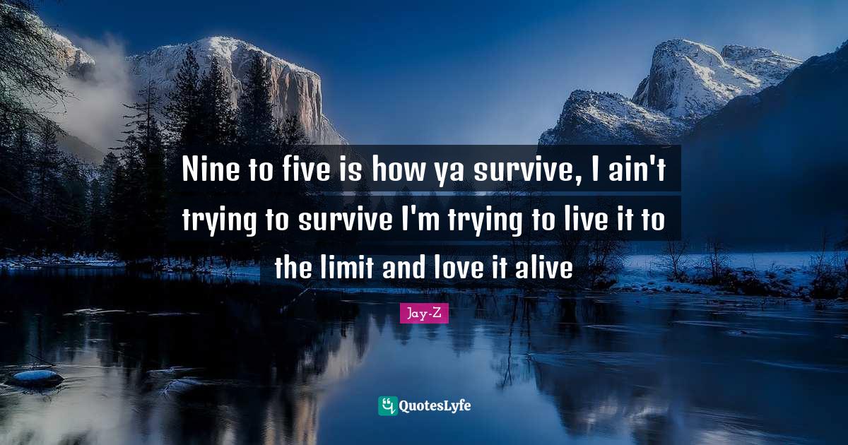 This page presents the quote "Nine to five is how ya survive, I ain't trying to survive I'm trying to live it to the limit and love it alive". Author of this quote is Jay-Z. This quote is about nine, and love, trying, alive, five,.