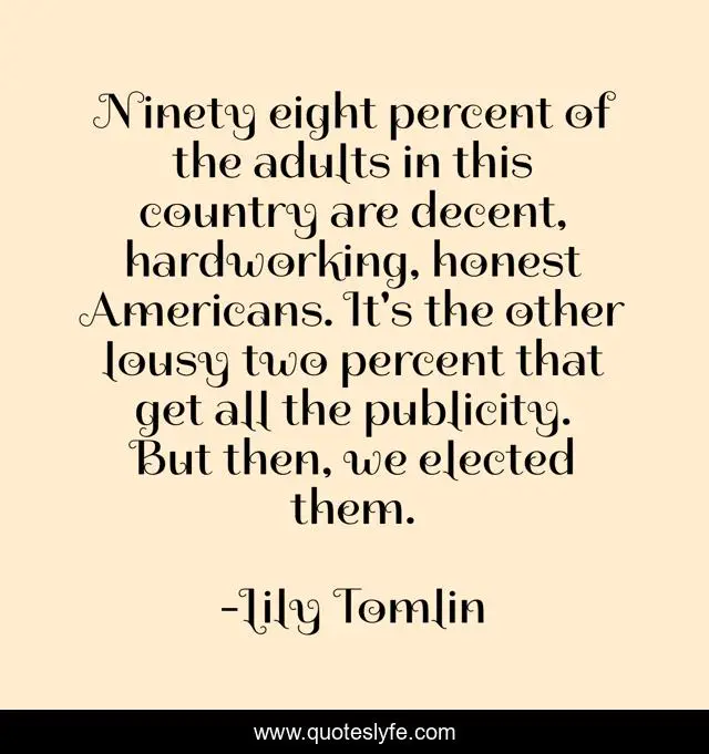 This page presents the quote "Ninety eight percent of the adults in this country are decent, hardworking, honest Americans. It's the other lousy two percent that get all the publicity. But then, we elected them.". Author of this quote is Lily Tomlin. This quote is about country, two, honest,.
