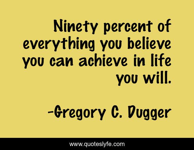 This page presents the quote "Ninety percent of everything you believe you can achieve in life you will.". Author of this quote is Gregory C. Dugger. This quote is about enthusiasm, inspirational,.