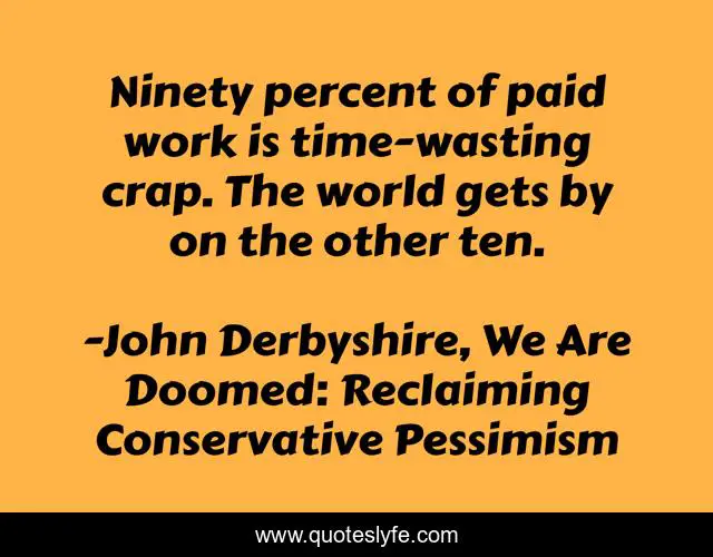 This page presents the quote "Ninety percent of paid work is time-wasting crap. The world gets by on the other ten.". Author of this quote is John Derbyshire, We Are Doomed: Reclaiming Conservative Pessimism. This quote is about work, jobs, working,.