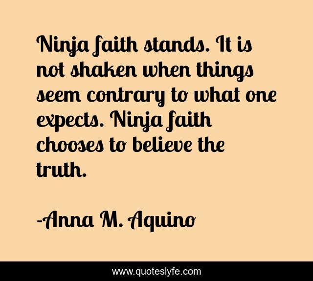 This page presents the quote "Ninja faith stands. It is not shaken when things seem contrary to what one expects. Ninja faith chooses to believe the truth.". Author of this quote is Anna M. Aquino. This quote is about anna-aquino, momisms, raising-children, parenting, training-manual, ninja-mom, mom, confessions-of-a-ninja-mom,.