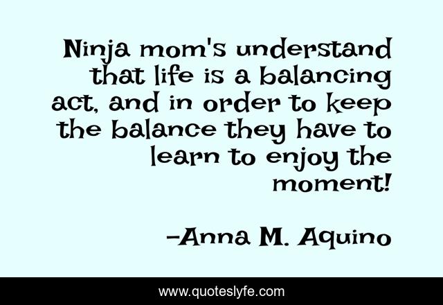 This page presents the quote "Ninja mom's understand that life is a balancing act, and in order to keep the balance they have to learn to enjoy the moment!". Author of this quote is Anna M. Aquino. This quote is about anna-aquino, momisms, raising-children, parenting, training-manual, ninja-mom, mom, confessions-of-a-ninja-mom,.