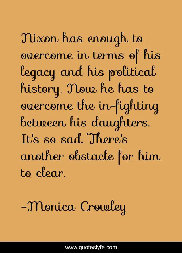 This page presents the quote "Nixon has enough to overcome in terms of his legacy and his political history. Now he has to overcome the in-fighting between his daughters. It's so sad. There's another obstacle for him to clear.". Author of this quote is Monica Crowley. This quote is about legacy, political, history,.