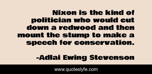 This page presents the quote "Nixon is the kind of politician who would cut down a redwood and then mount the stump to make a speech for conservation.". Author of this quote is Adlai Ewing Stevenson. This quote is about richard-nixon, hypocrisy,.