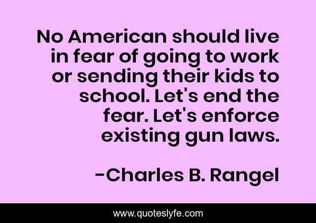 This page presents the quote "No American should live in fear of going to work or sending their kids to school. Let's end the fear. Let's enforce existing gun laws.". Author of this quote is Charles B. Rangel. This quote is about school, work,.