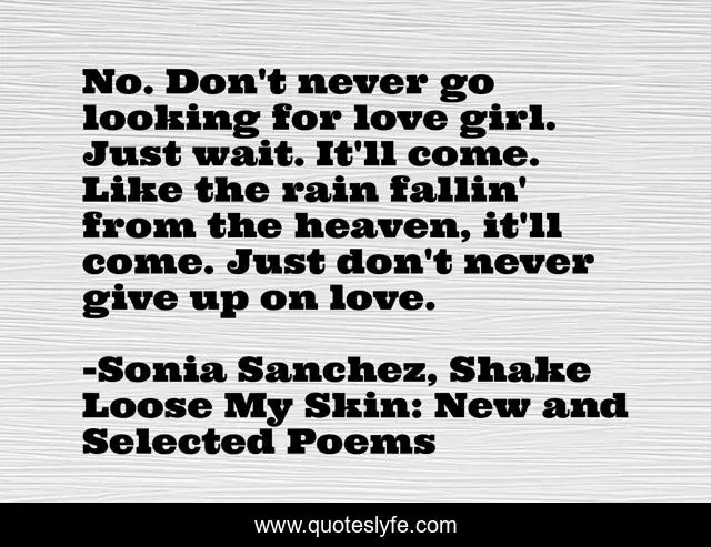 This page presents the quote "No. Don't never go looking for love girl. Just wait. It'll come. Like the rain fallin' from the heaven, it'll come. Just don't never give up on love.". Author of this quote is Sonia Sanchez, Shake Loose My Skin: New and Selected Poems. This quote is about come, heaven, love, affection, wait,.
